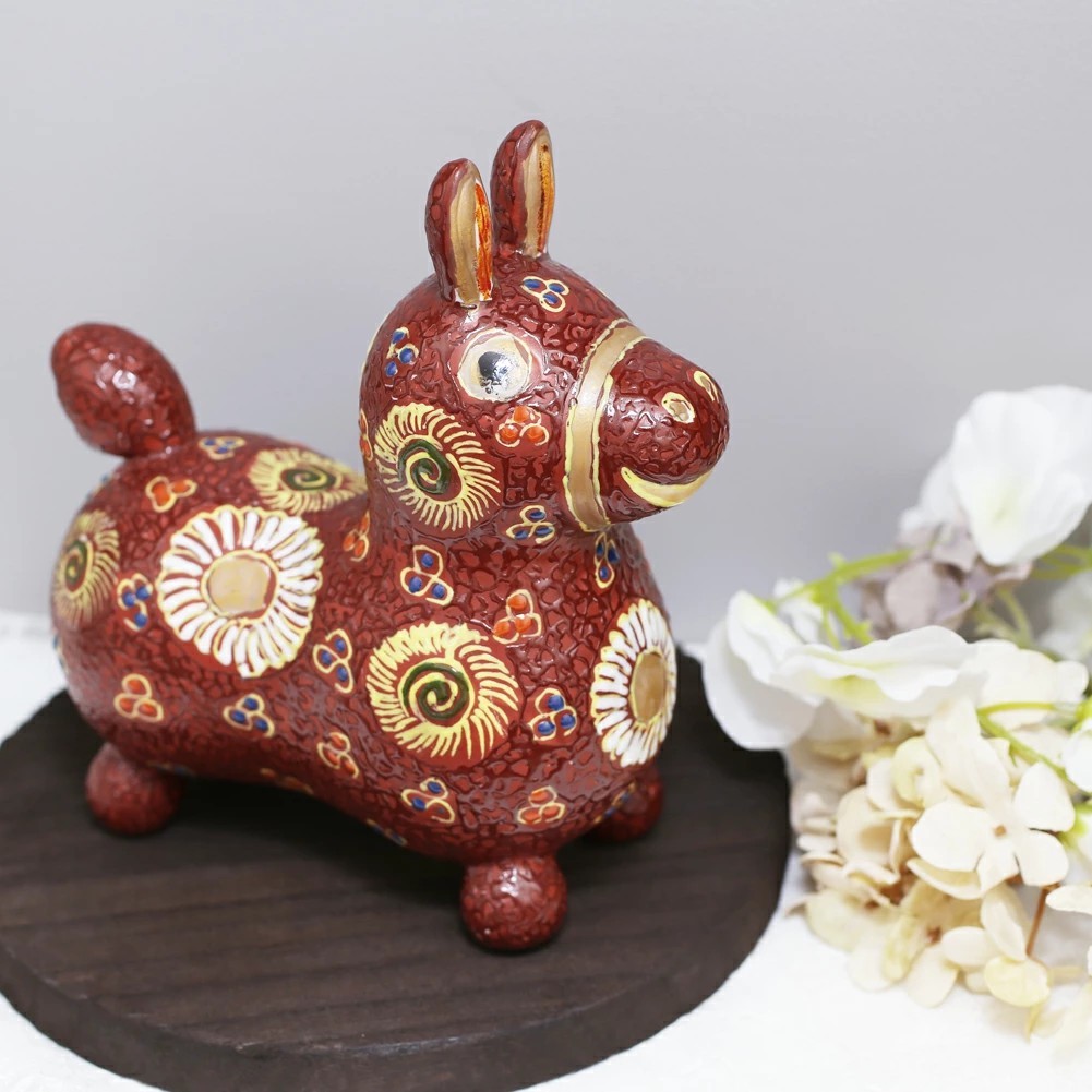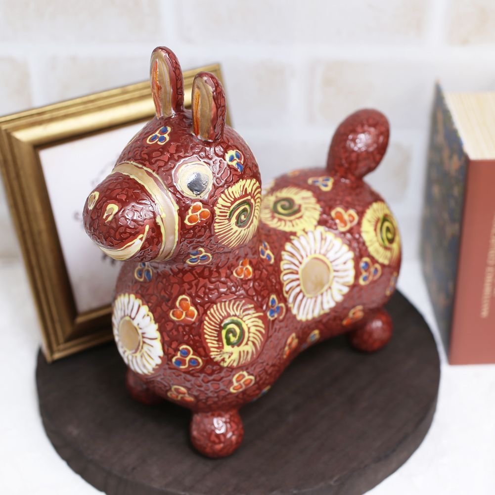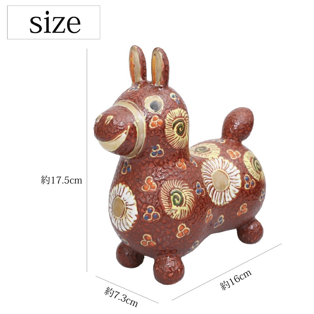 九谷焼は、石川県南部で生産される色絵の磁器です。久谷五彩(赤、黄、緑、紺、紫)という色鮮やかな上絵が特徴です。上絵つきとは、本焼きした陶磁器の釉薬の上に顔料で模様を描き、再度焼く技法です。その歴史は、江戸時代に加賀藩が良質な磁石を発見したのを機に、殖産政策として始められたとされたいます。「双仙作 デコ盛赤花文」のロディは、ケーキのデコレーションのように盛り上がった線を描いていく盛技法の作品。表面の凸凹とした立体感と金彩の組み合わせが華やかな逸品です。イタリアの人気玩具「RODY(ロディ)」と伝統工芸「九谷焼」がコラボレーションした置物です。「RODY」のモチーフである「馬」は「飛躍」「跳ね上がる」など縁起のいい意味があり、現代版「馬の縁起置物」として喜ばれています。縁起物である馬モチーフの置物は、出産祝いや開店祝いにはもちろん、引き出物としてもお使いいただける、双仙さん作の逸品です。360年という歴史ある九谷焼。江戸初期に誕生したとされる古九谷の画風は今もなお人気があり、また明治期には庄三風など絢爛豪華な九谷焼が輸出され、ジャパン・クタニとして海外でも高く評価されています。2024年に40周年を迎えた子ども用バランスボール「ロディ」と、九谷焼をコラボレーションさせた、デザイン性が高くコロンとまるいフォルムが愛くるしい置物です。Rodyのロゴが入った専用の桐箱に入れてのお届けとなります。ご希望の方には無料のプレゼント包装もございます。