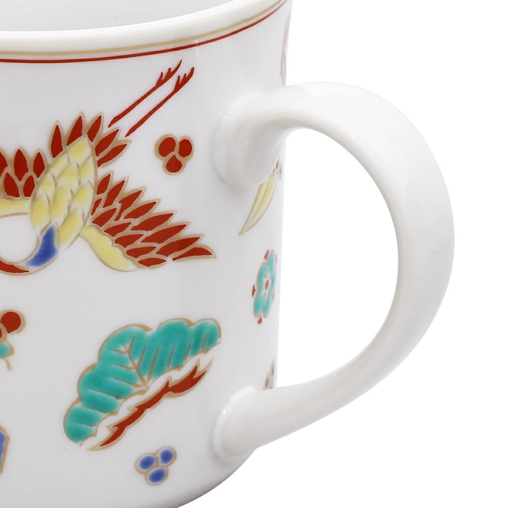 九谷焼は、石川県南部で生産される色絵の磁器です。久谷五彩(赤、黄、緑、紺、紫)という色鮮やかな上絵が特徴です。上絵つきとは、本焼きした陶磁器の釉薬の上に顔料で模様を描き、再度焼く技法です。その歴史は、江戸時代に加賀藩が良質な磁石を発見したのを機に、殖産政策として始められたとされたいます。上品な色合いの色鮮やかで素敵な縁起マグカップが登場。オシャレなデザインでおうちのインテリアにもおすすめです!九谷焼の色絵の名窯である青郊窯。独自に開発した、透明感があり、かつ層の深みのある和絵の具が作品の魅力を引きたてています。実用性はもちろん、結婚祝い、記念日、開店祝いなどの贈り物としてや、コレクション、インテリアとしても大人気のマグカップです。