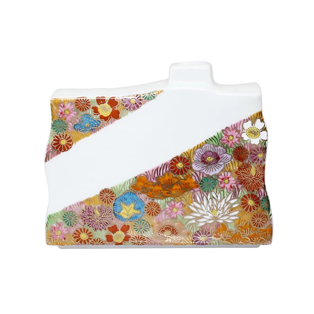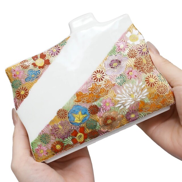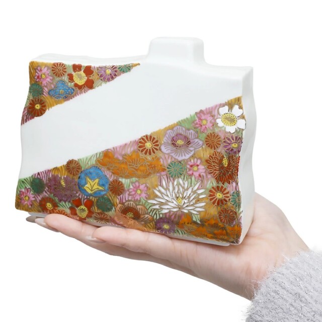 九谷焼は、石川県南部で生産される色絵の磁器です。久谷五彩(赤、黄、緑、紺、紫)という色鮮やかな上絵が特徴です。お部屋を華やかに彩ってくれる九谷焼の一輪生が登場!華やかな花瓶はシンプルな生け花やドライフラワーでもお部屋をぱっと明るくしてくれます。華やかな花々が敷き詰められ、さらに豪華な金彩が加わることで、格調高い美しさを放っています。結婚祝いや出産祝い、開店祝いなど贈り物やコレクションとしてもおススメの逸品です。360年という歴史ある九谷焼。江戸初期に誕生したとされる古九谷の画風は今もなお人気があり、また明治期には庄三風など絢爛豪華な九谷焼が輸出され、ジャパン・クタニとして海外でも高く評価されています。ちょうどいいサイズ感の一輪生は、お花の取り換えも楽しく、フラワーベースの場所を変える時も移動が楽にできます。華やかなデザインの一輪生を玄関やリビング等に飾って、毎日過ごすお部屋を華やかな癒し空間に。
