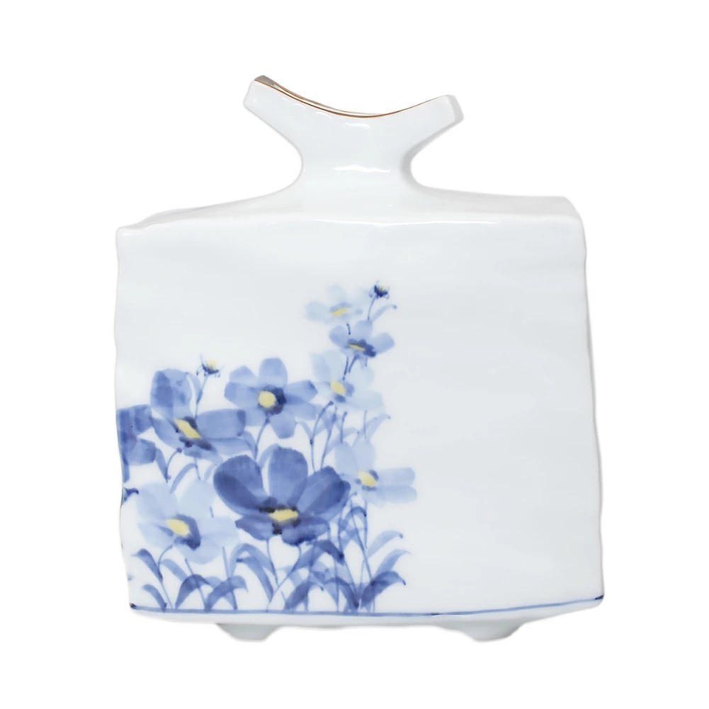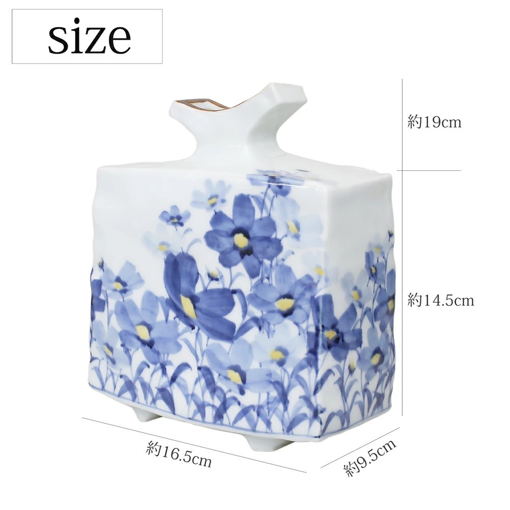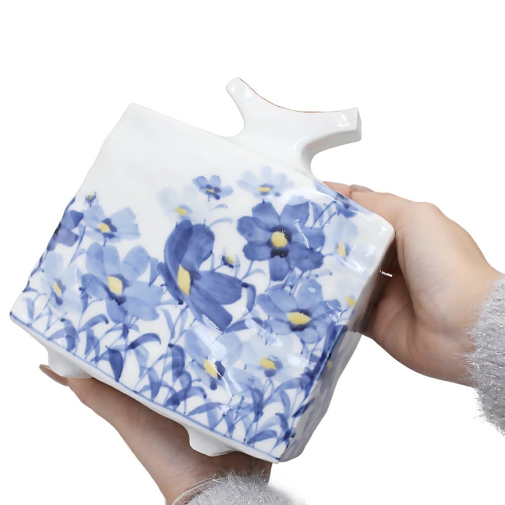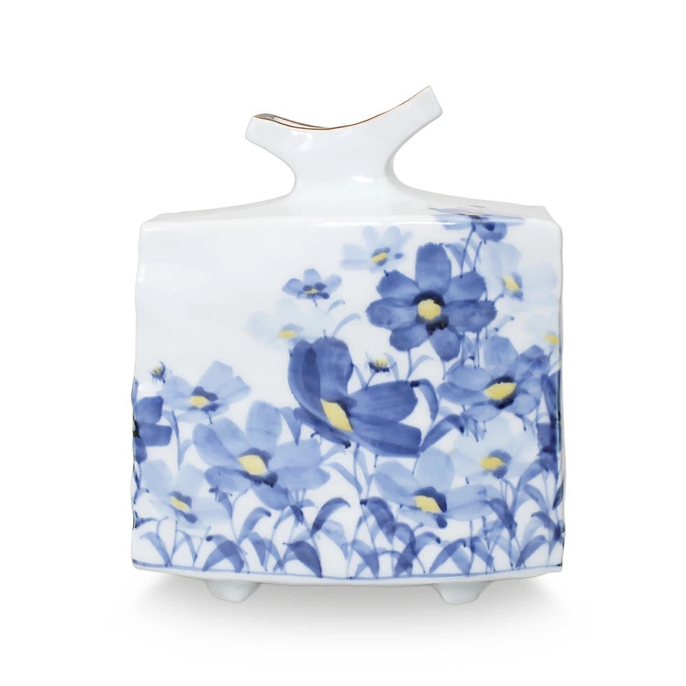 九谷焼は、石川県南部で生産される色絵の磁器です。久谷五彩(赤、黄、緑、紺、紫)という色鮮やかな上絵が特徴です。お部屋を華やかに彩ってくれる九谷焼の一輪生が登場!華やかな花瓶はシンプルな生け花やドライフラワーでもお部屋をぱっと明るくしてくれます。染付の絵柄は、鮮やかな藍色で描かれることが最大の特徴です。藍色の顔料は焼成によって深みが増し、絵柄に奥行きを生み出します。金沢美術工芸大学で学んだ後、九谷焼の第一人者である北出不二雄氏に師事し、伝統的な技術と自身の女性らしい繊細な感性を融合させた作品を生み出しています。少し大きいサイズ感の花瓶は、お花の取り換えも楽しく、フラワーベースの場所を変える時も移動が楽にできます。華やかなデザインの花瓶を玄関やリビング等に飾って、毎日過ごすお部屋を華やかな癒し空間に。