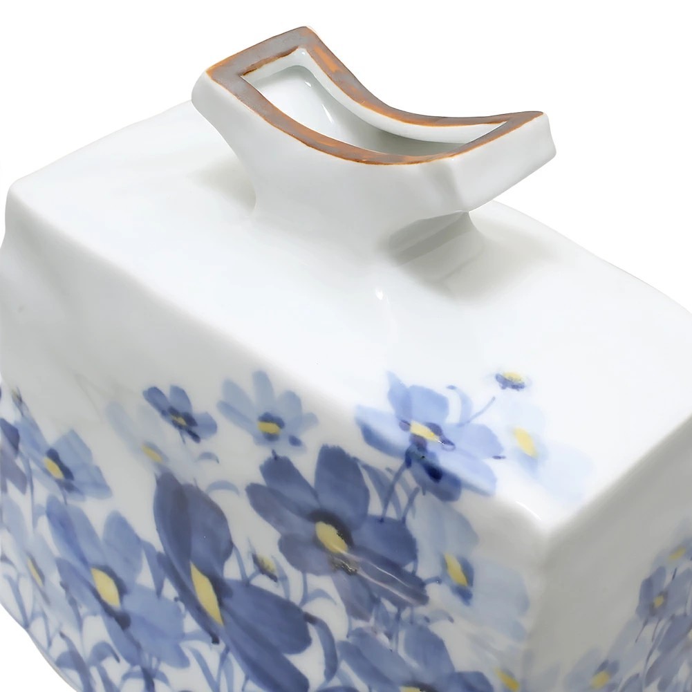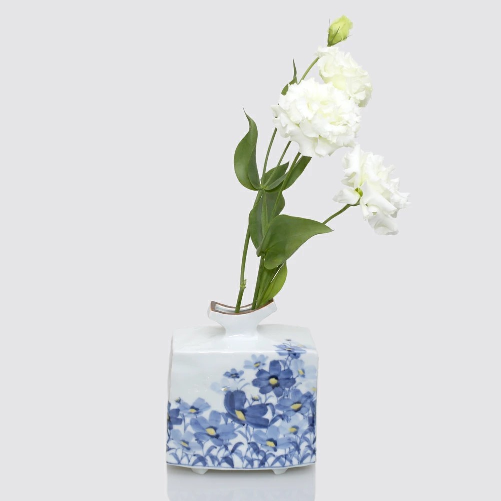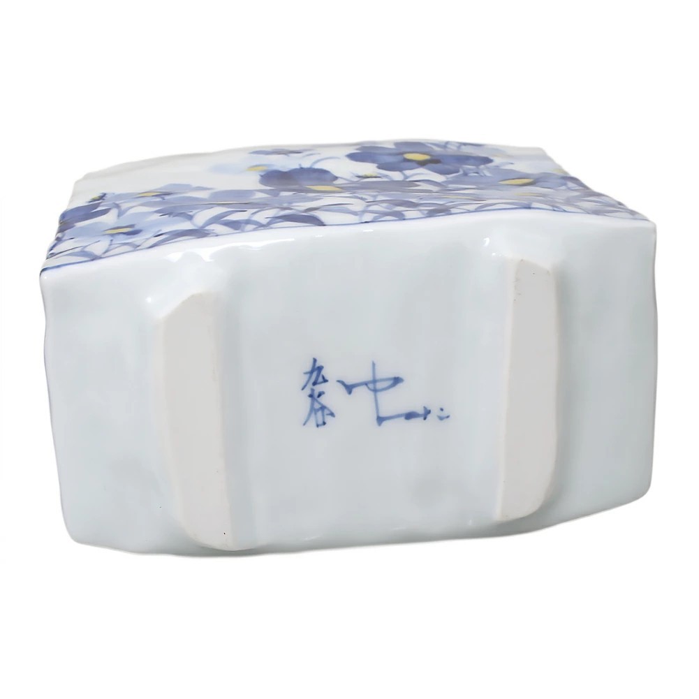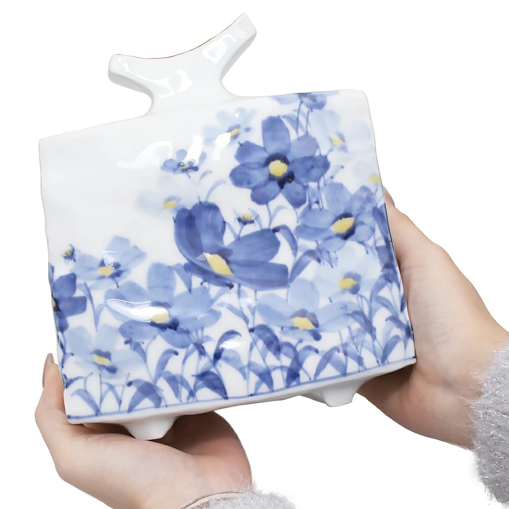 九谷焼は、石川県南部で生産される色絵の磁器です。久谷五彩(赤、黄、緑、紺、紫)という色鮮やかな上絵が特徴です。お部屋を華やかに彩ってくれる九谷焼の一輪生が登場!華やかな花瓶はシンプルな生け花やドライフラワーでもお部屋をぱっと明るくしてくれます。染付の絵柄は、鮮やかな藍色で描かれることが最大の特徴です。藍色の顔料は焼成によって深みが増し、絵柄に奥行きを生み出します。金沢美術工芸大学で学んだ後、九谷焼の第一人者である北出不二雄氏に師事し、伝統的な技術と自身の女性らしい繊細な感性を融合させた作品を生み出しています。少し大きいサイズ感の花瓶は、お花の取り換えも楽しく、フラワーベースの場所を変える時も移動が楽にできます。華やかなデザインの花瓶を玄関やリビング等に飾って、毎日過ごすお部屋を華やかな癒し空間に。