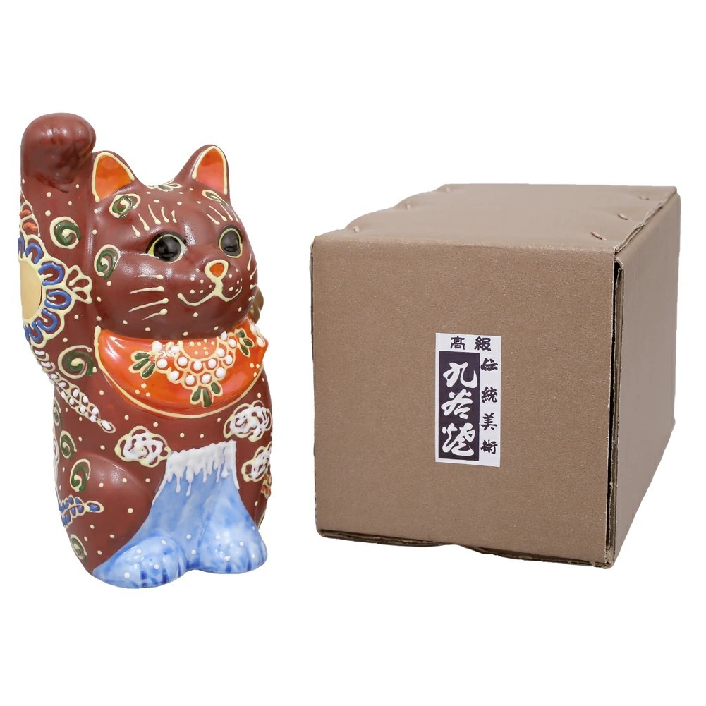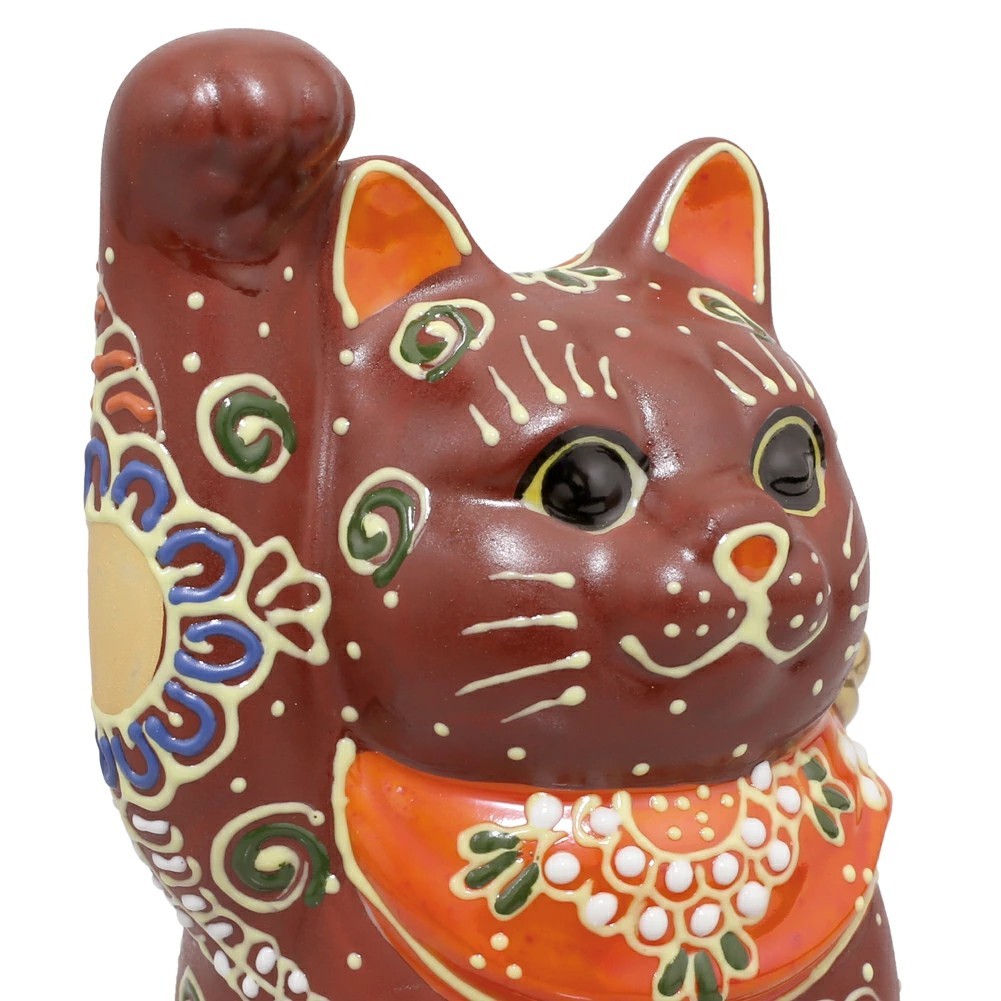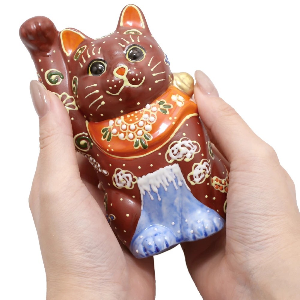 九谷焼は、石川県南部で生産される色絵の磁器です。久谷五彩(赤、黄、緑、紺、紫)という色鮮やかな上絵が特徴です。金運と幸運を招く右手招き猫。開店祝いにはもちろん、お部屋のインテリアとしてもおススメです。ケーキのデコレーションのように盛り上がった線を描いていく盛技法の作品。表面の凸凹とした立体感と金彩の組み合わせが華やかな逸品です。結婚祝いや出産祝い、開店祝いなど贈り物やコレクションとしてもおススメの逸品です。360年という歴史ある九谷焼。江戸初期に誕生したとされる古九谷の画風は今もなお人気があり、また明治期には庄三風など絢爛豪華な九谷焼が輸出され、ジャパン・クタニとして海外でも高く評価されています。思わず撫でたくなる愛らしい右手招き猫は、毎日を華やかに彩ってくれます。専用の紙箱に入れてのお届け!ご希望の方には無料のプレゼント包装も受けたまわります。