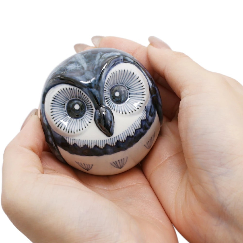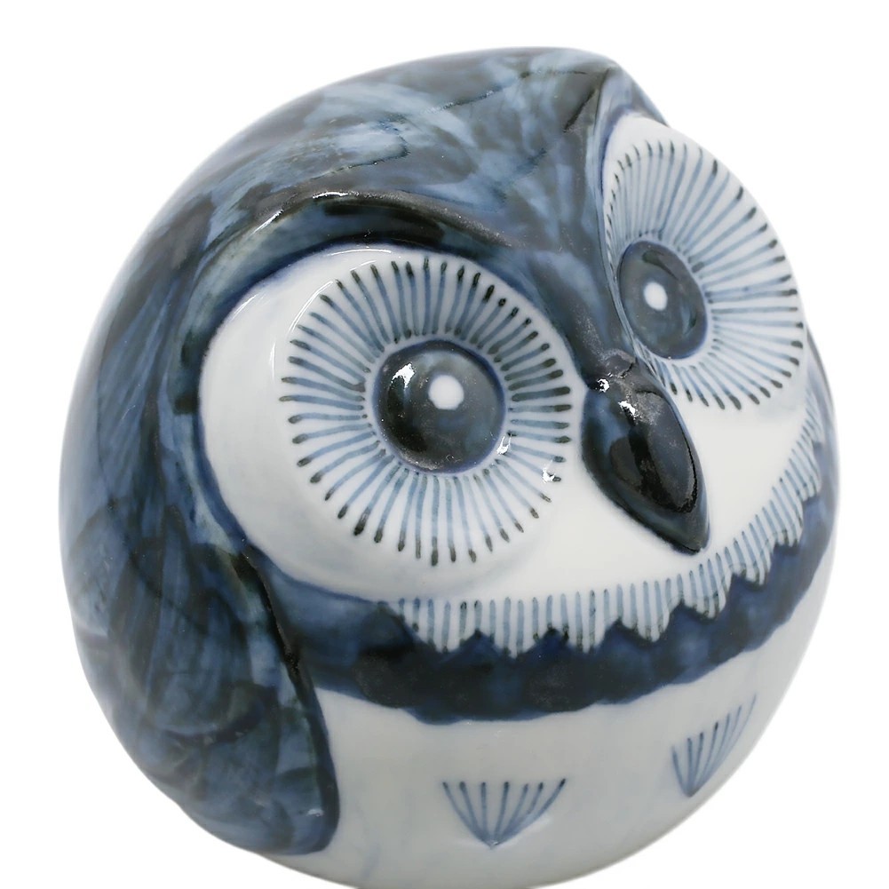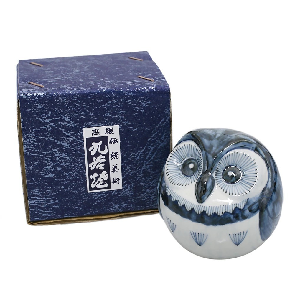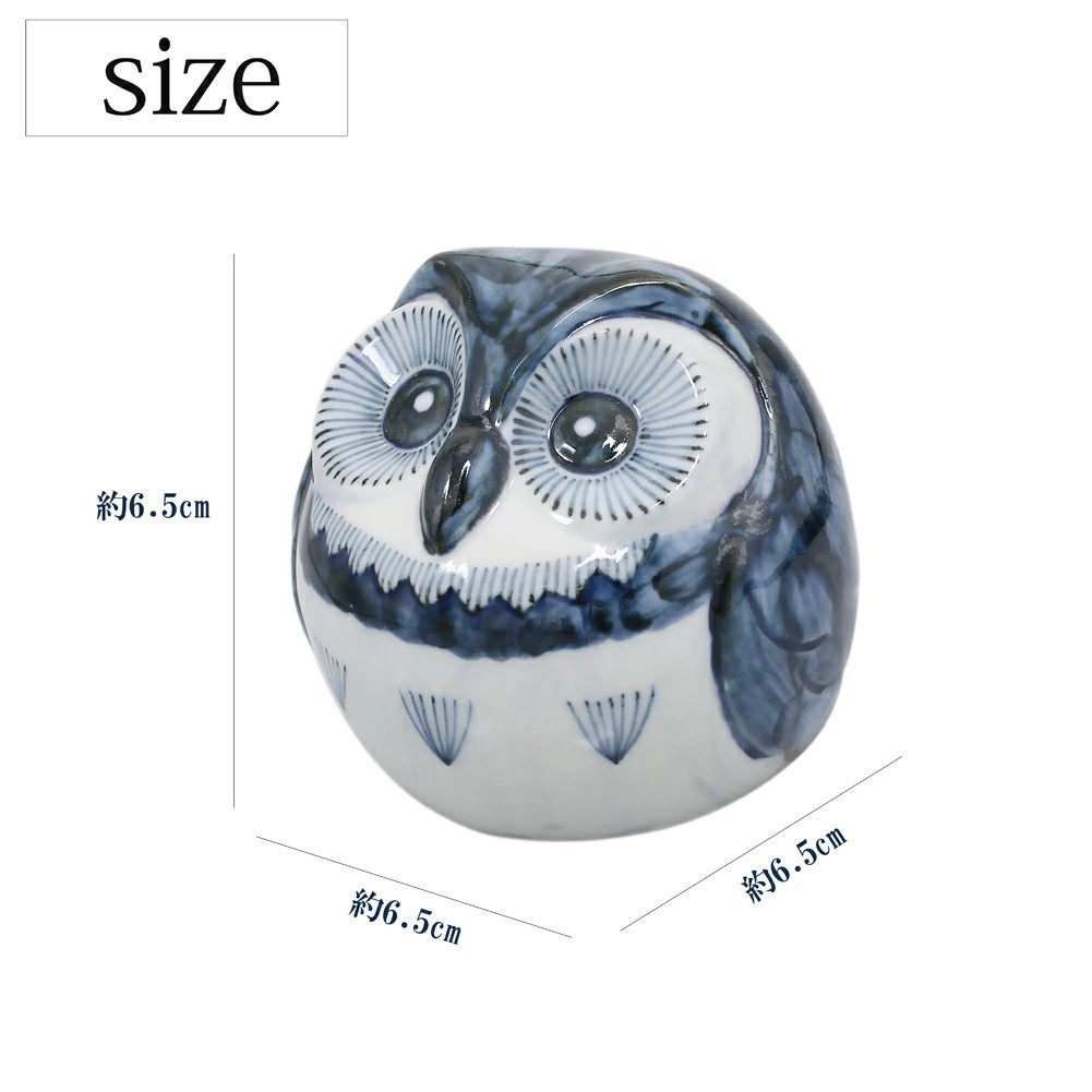 九谷焼は、石川県南部で生産される色絵の磁器です。久谷五彩(赤、黄、緑、紺、紫)という色鮮やかな上絵が特徴です。九谷焼の色彩の深みと厚く盛り上げる着彩の、風合いをお楽しみください。フクロウは「不苦労」や「福老」といった幸せを呼ぶ言葉に当て字されており、長寿や祈願成就の象徴ともされています。お部屋のインテリアとしてもおススメです。染付の絵柄は、鮮やかな藍色で描かれることが最大の特徴です。藍色の顔料は焼成によって深みが増し、絵柄に奥行きを生み出します。結婚祝いや出産祝い、開店祝いなど贈り物やコレクションとしてもおススメの逸品です。360年という歴史ある九谷焼。江戸初期に誕生したとされる古九谷の画風は今もなお人気があり、また明治期には庄三風など絢爛豪華な九谷焼が輸出され、ジャパン・クタニとして海外でも高く評価されています。思わず撫でたくなるころんと愛らしいフクロウは、日々に幸せを運んでくれるラッキーバードともいわれています。専用の紙箱に入れてのお届け!ご希望の方には無料のプレゼント包装も受けたまわります。