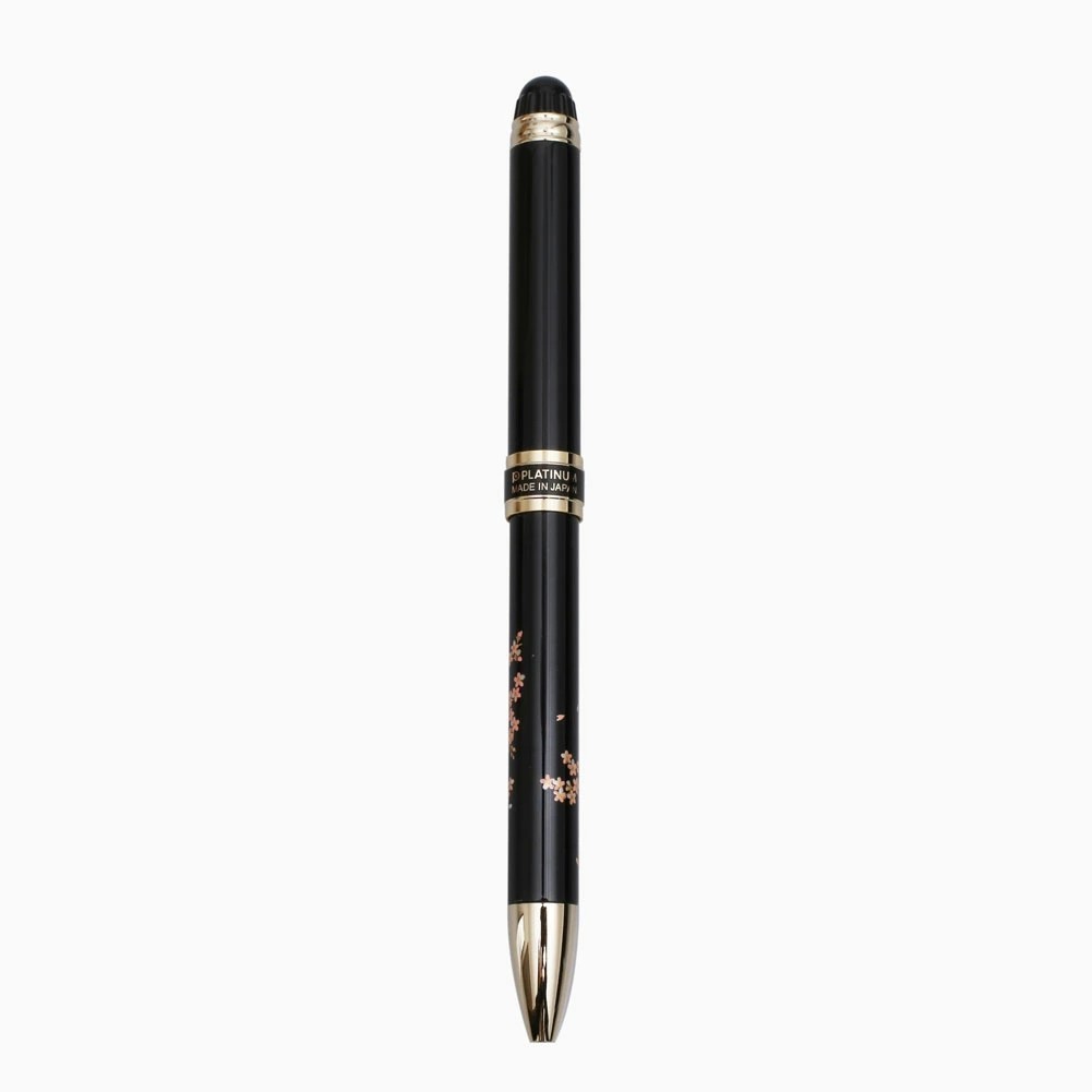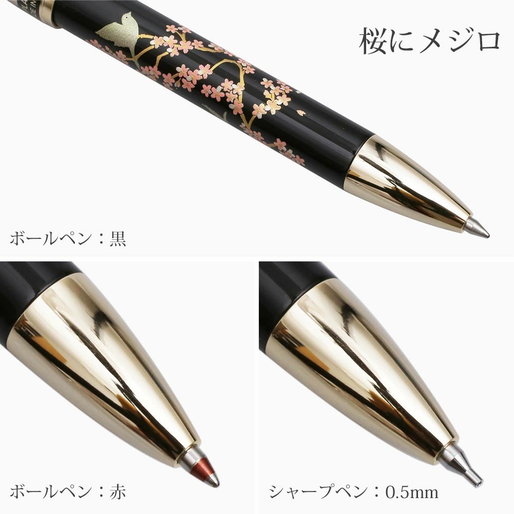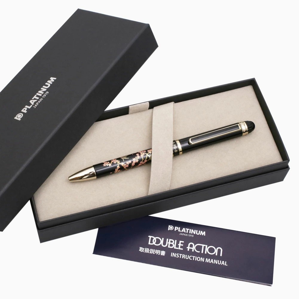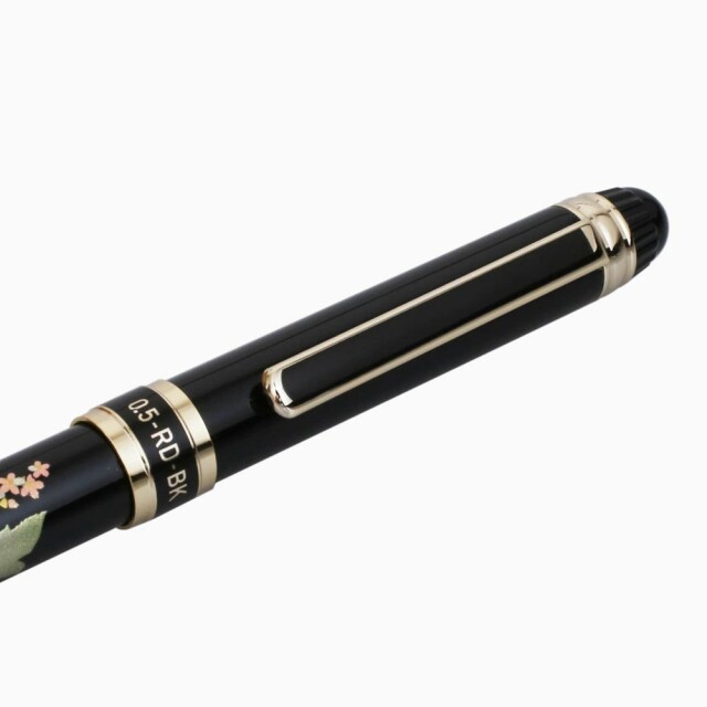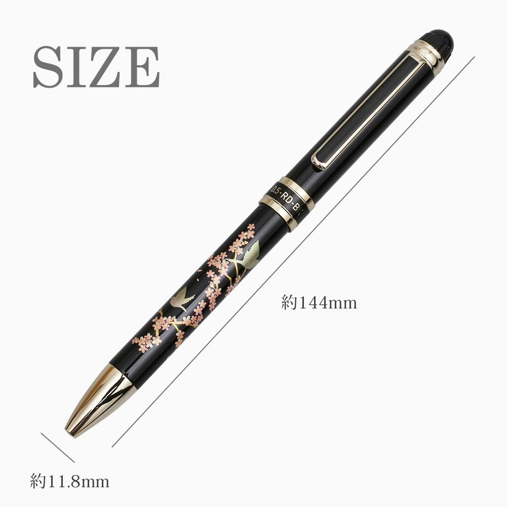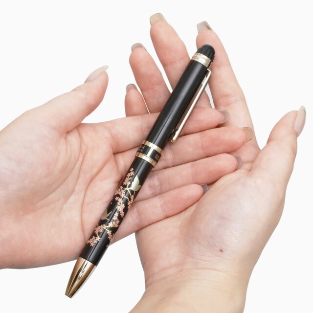 高級感のあるブラックにゴールドの金属トリムを合わせた品格のあるボールペン。凹凸のある質感や金粉の輝き、鮮やかで繊細な和柄を伝統的な現代技術で表現。フォーマルで知的な印象を与えます。ボールペンの黒/赤と0.5mmのシャープペンを1本にまとめた回転式操作で、切り替えがスムーズに!1本で筆記、修正、メモなど多様な用途に対応します。1919年に中田俊一が創業し、1979年に多機能ボールペンの先駆者となる「ダブルアクション」を発売。質実剛健なものづくりと革新的な機構で、日本の筆記文化を支え続けている老舗筆記具メーカーです。実際の蒔絵とは異なり、漆ではなくシルク印刷の下地絵柄に金色や銀色などの色粉を一本一本手作業で蒔く技法のこと。通常の印刷よりも厚みがあり、粉の反射や陰影によって立体的な質感が楽しめます。高級感のあるボールペンは自分へのご褒美にはもちろん、日本を感じさせるアイテムとして海外の方へのプレゼントにも大変喜ばれる逸品です。専用の化粧箱に入っており、見た目にも豪華な仕様になっております。