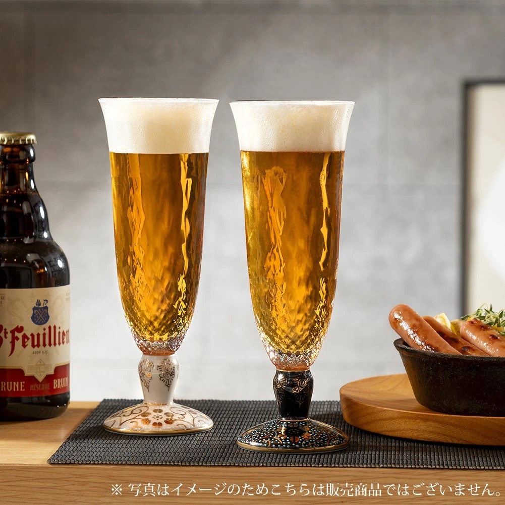 九谷焼の伝統技法で仕上げた磁器製の脚付きビアーグラス。華やかな絵付けと上品な佇まいが特徴で、ビールはもちろんシャンパンなどにもお使いいただけます。