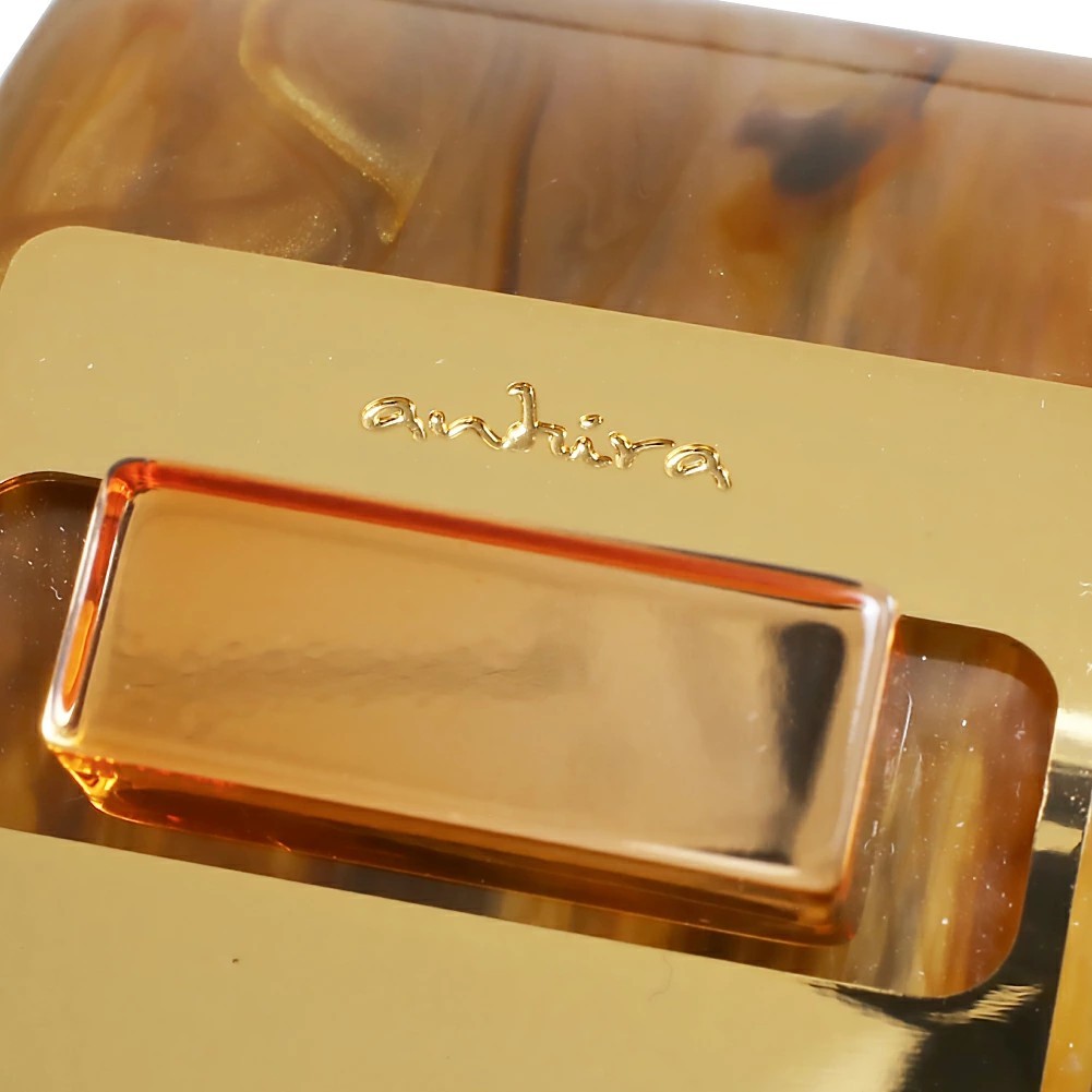 ブランドロゴが入った真鍮プレートと透明感のある樹脂が、シンプルながらも高級感を持たせたデザインです。