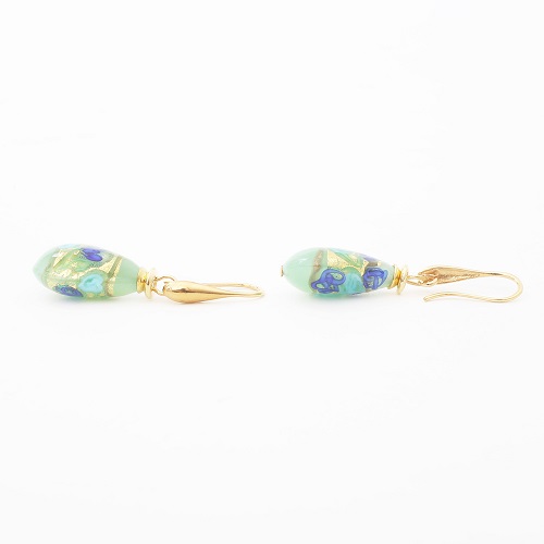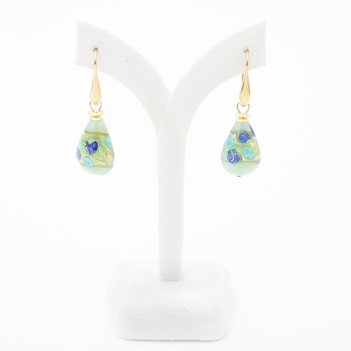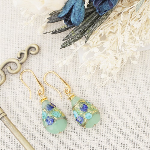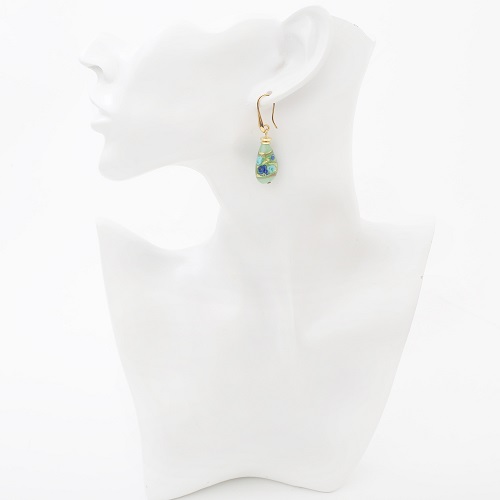 イタリア製<INES design>ゴルチェ・ブルー・ピアス♪ヴェネチアンガラスで有名なイタリア・ムラーノ島、マエストロと呼ばれる熟練した職人たちが、伝統技法を用い一つ一つ丁寧に手作りしています。女性らしい大人っぽさを引き出すグリーンカラー。着けてみるとその色合いから感じる派手さは少なく、上品に自己主張をする大人のジュエリー。ベネチアンガラスの中に純金箔を閉じ込めた、上品な色合いのグリーンドロップデザインは、イタリア人ならではの独特な美しさを放ち、毎日のお洒落に欠かせないアイテムに♪幅広いコーディネートでお使い頂ける女性らしいデザインのベネチアンピアスは、大切な人へのプレゼントや、毎日の自分へのご褒美にも大変おススメの大人ジュエリーです☆
