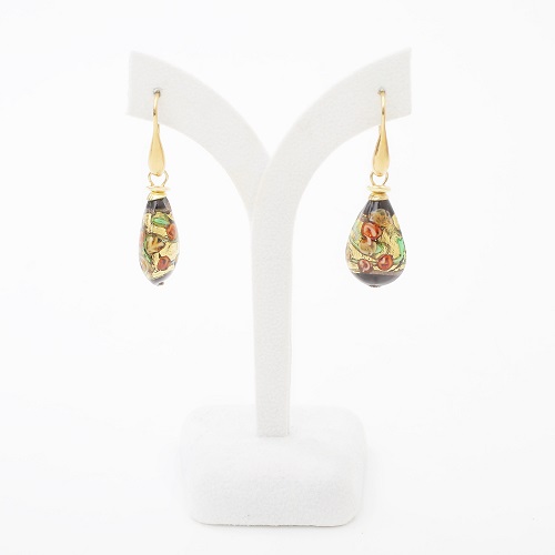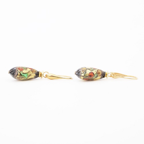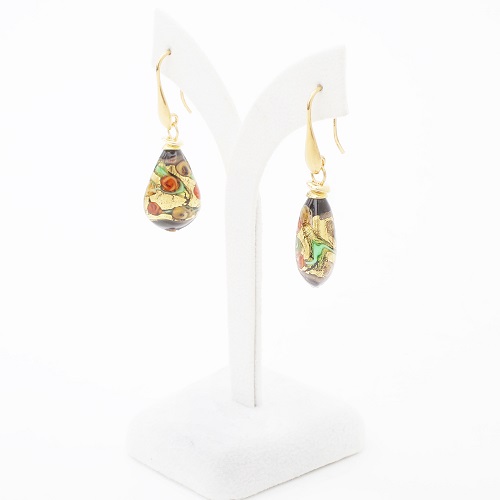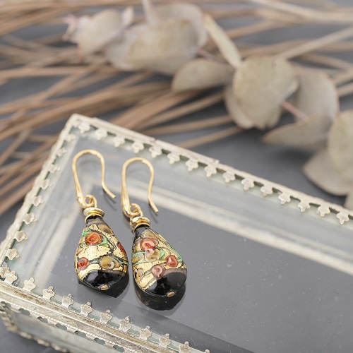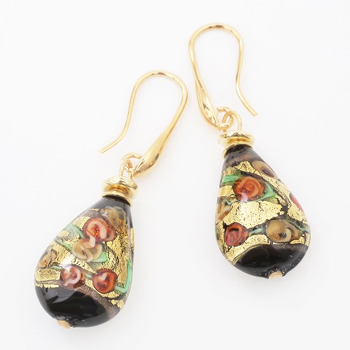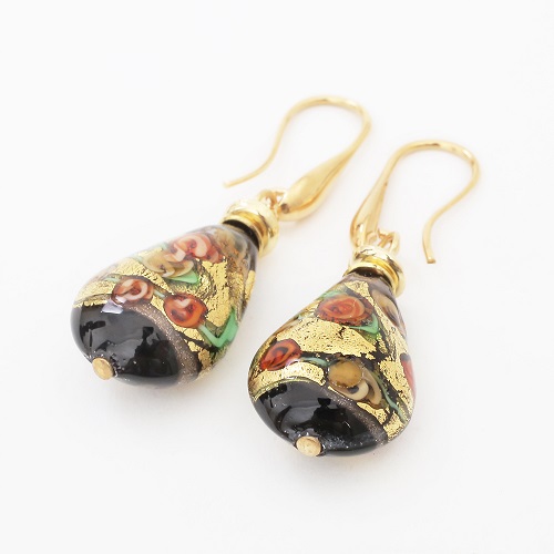 イタリア製<INES design>ゴルチェ・ブルー・ピアス♪ヴェネチアンガラスで有名なイタリア・ムラーノ島、マエストロと呼ばれる熟練した職人たちが、伝統技法を用い一つ一つ丁寧に手作りしています。女性らしい大人っぽさを引き出すブラックカラー。着けてみるとその色合いから感じる派手さは少なく、上品に自己主張をする大人のジュエリー。ベネチアンガラスの中に純金箔を閉じ込めた、上品な色合いのブラックドロップデザインは、イタリア人ならではの独特な美しさを放ち、毎日のお洒落に欠かせないアイテムに♪幅広いコーディネートでお使い頂ける女性らしいデザインのベネチアンピアスは、大切な人へのプレゼントや、毎日の自分へのご褒美にも大変おススメの大人ジュエリーです☆