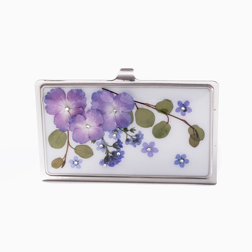 枯れない花 プリザーブドフラワーを使ったお洒落で個性あふれる名刺入れ。プリザーブド・フラワーとは、造花ではなく、生け花に特殊な加工を施して、水やりをしなくても枯れることのない、長くその美しさを保ち続けるようにした花です。大切な名刺やカードを約20枚収納でき、デザインにもこだわったハイセンスな名刺ケース。蓋の裏面が鏡仕様になっているので、ちょっとしたお化粧直しにも便利です!花の色合いや配列、大きさなど、デザイナーが一つ一つ丁寧に作り上げた名刺ケースなので、まったく同じものはない、自分だけのデザイン。プレゼントにも大変おすすめです!!