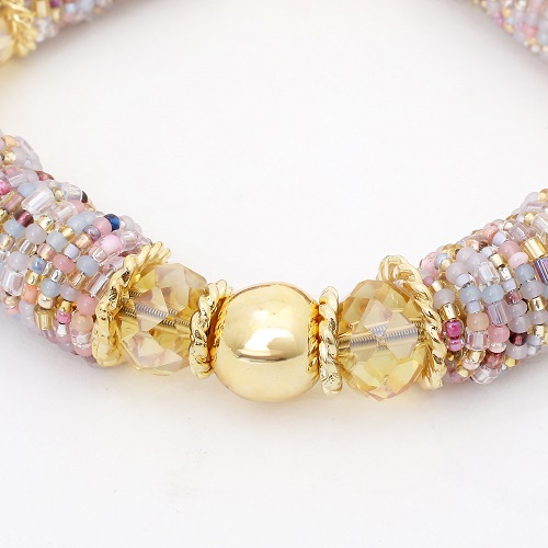 ゴールドボールとピンク系のビーズをらせん状に組み上げた、