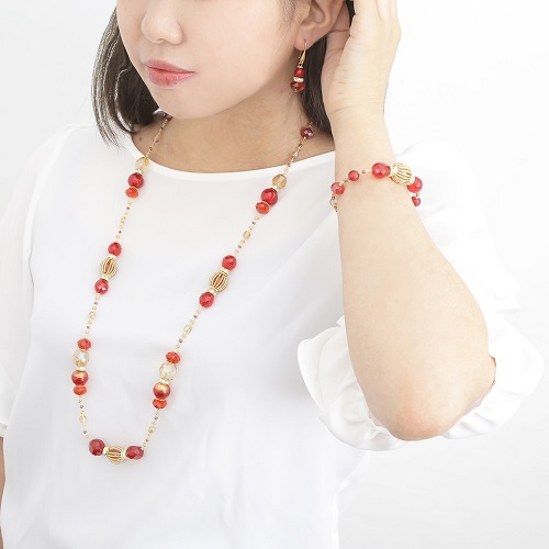イタリア・水の都「ヴェネチア」からの贈り物マエストロと呼ばれる熟練した職人たちがベネチアンガラスの伝統の技法を用い、一つ一つ丁寧に仕上げられた上品なジュエリー。その美しい模様は、まるで芸術品とまで称されるほどです。ミッレカットを施したレッドとゴールドのその色合いのコントラストが美しく、また、ゴールドのレトロパーツをランダムに配したデザインセンスはイタリア人デザイナーの感性そのものです。着けてみるとその色合いから感じる派手さは少なく、むしろ上品に自己主張をする大人のジュエリーと言えます。別売りでピアスとネックレスをご用意していますので、毎日のオシャレだけではなく、トータルコーディネートもお楽しみいただける逸品です。大切な人への贈り物や、自分へのご褒美にも大変お勧めです。