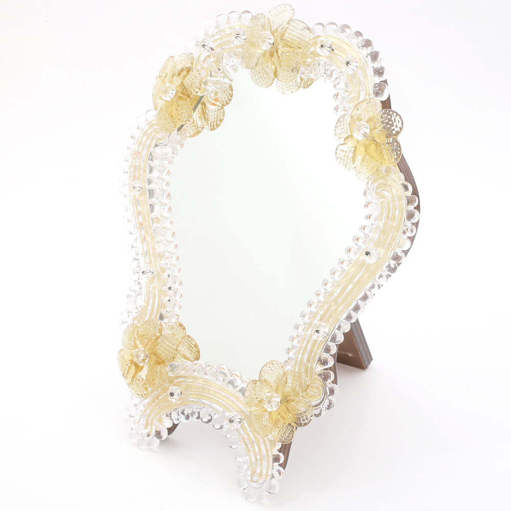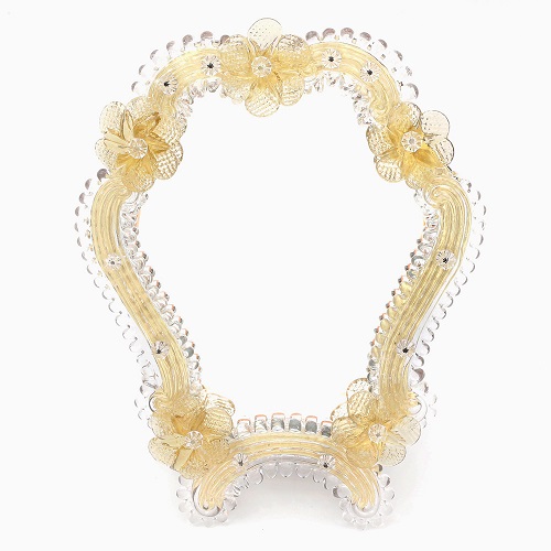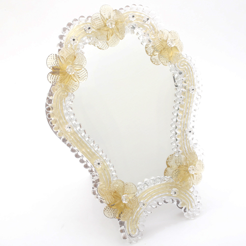 熟練された職人が手掛ける、芸術あふれる逸品。手作りの為、まったく同じものは他にはなく、 自分だけのインテリアとしての持つ喜びも格別です。純金箔を使ったその華やかで、豪華な色合いと、イエローフラワーが上品でかわいい卓上ミラーです。イタリア人ならではの色合いと配色センスが光る、芸術品です。毎日のお化粧やスキンケアをお洒落に楽しめる、ベネチアンガラス・テーブルミラーは、インテリアとしてお部屋に飾ってもお洒落なミラーです☆大切な人へのプレゼントにもおすすめです!