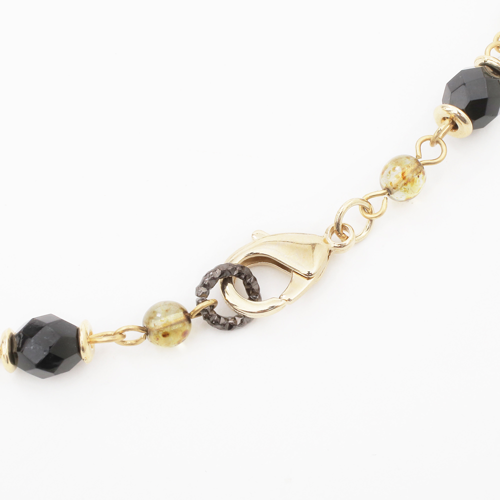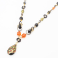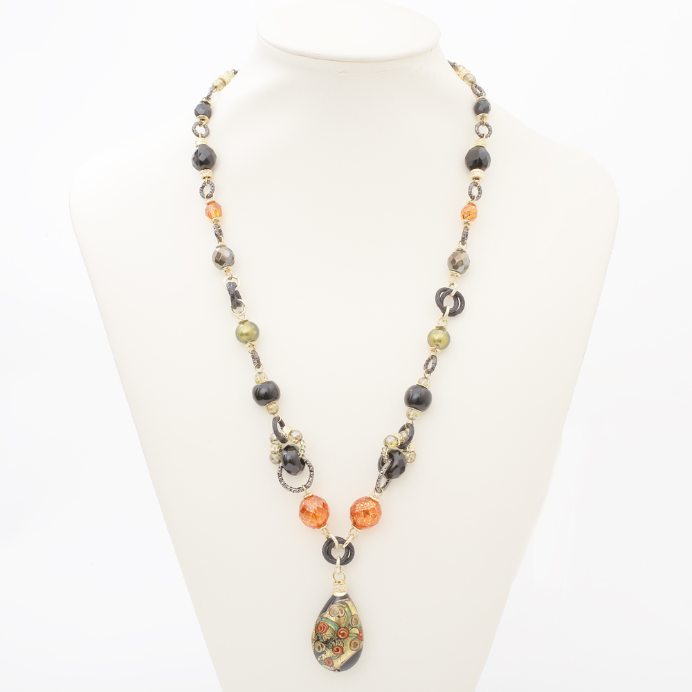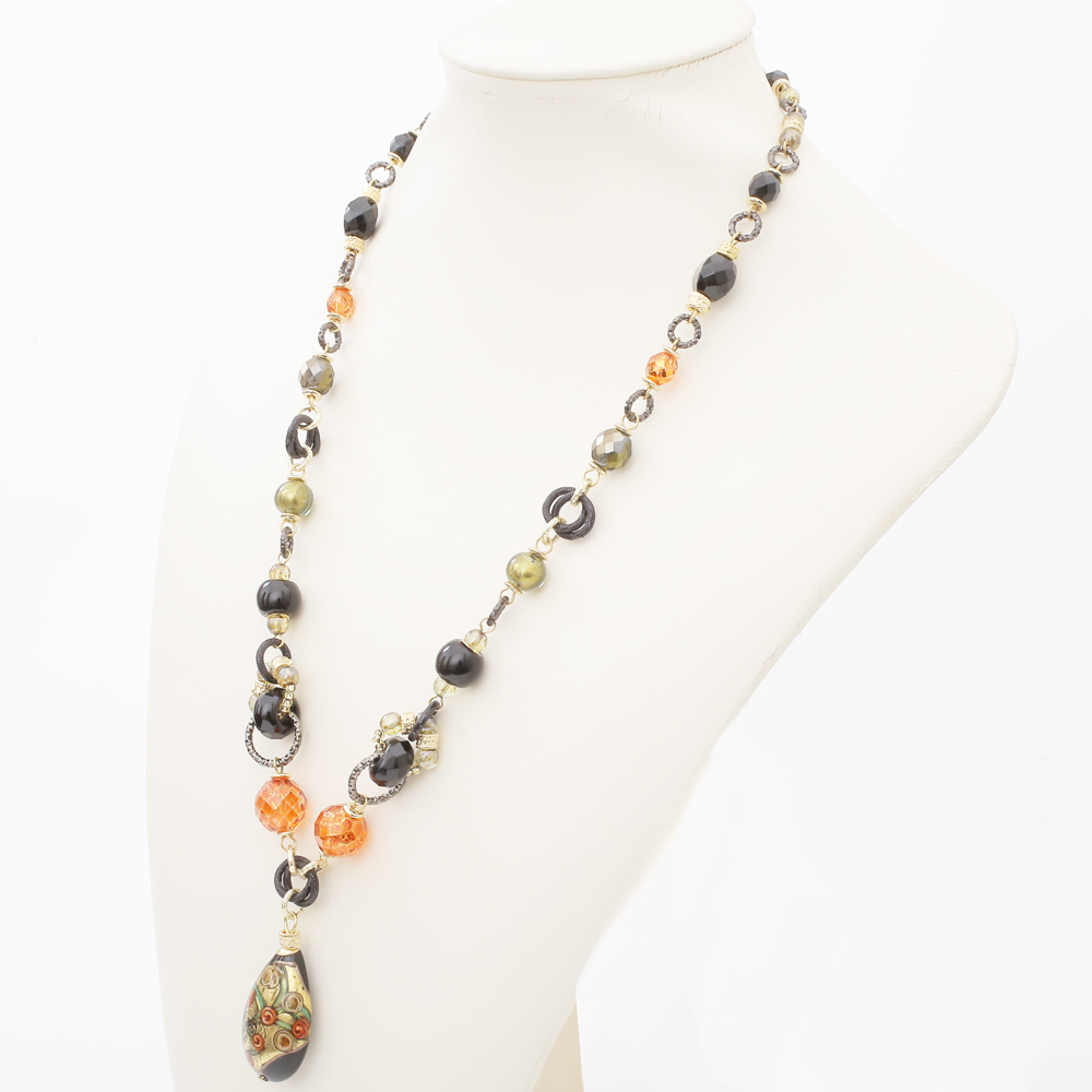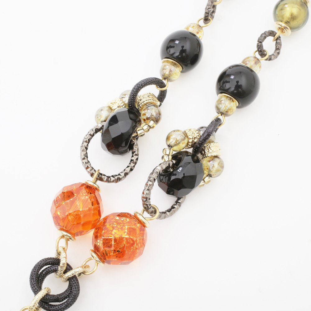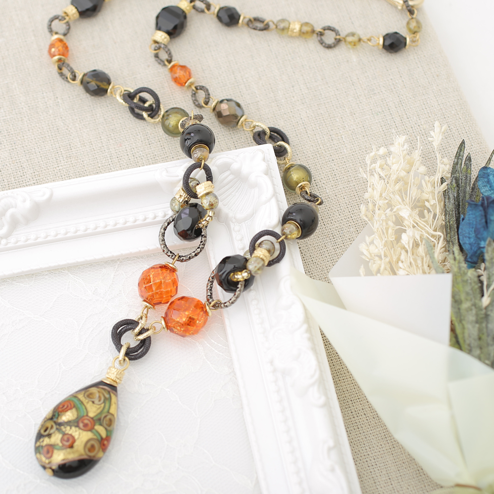 ブラックカラーを基調とし、ゴールドやオレンジと合わさることでダーク過ぎない、上品なネックレスに