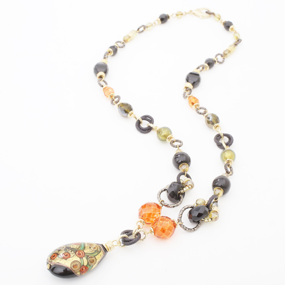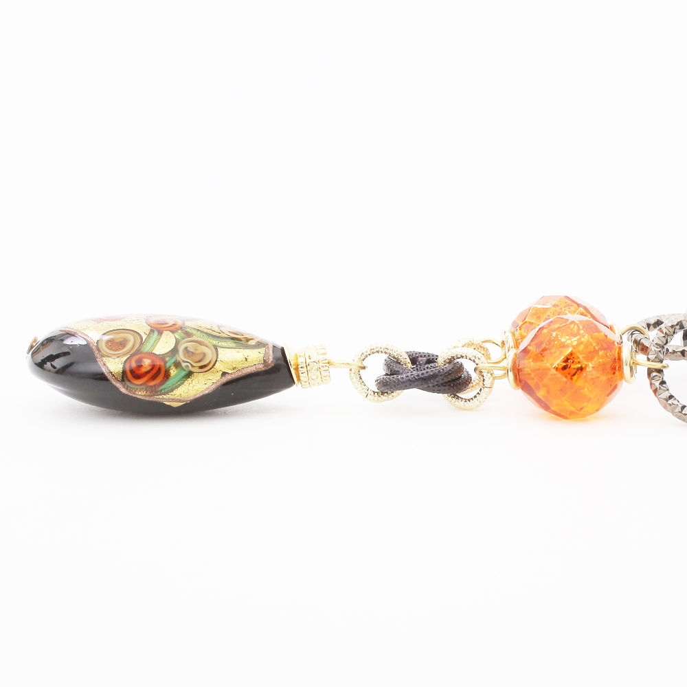 イタリア・水の都「ヴェネチア」からの贈り物。マエストロと呼ばれる熟練した職人たちがベネチアンガラスの伝統の技法を用い、一つ一つ丁寧に仕上げられた上品なアクセサリー。その美しい模様は、まるで芸術品とまで称されるほどです。ブラックカラーを基調とし、ゴールドやオレンジと合わさることでダーク過ぎない、上品なネックレスに純金箔をガラスの中に閉じ込めたその山吹色とブラックドロップの色合いとのコントラストが美しいデザイン大切な人への贈り物や、自分へのご褒美にも最適のアクセサリーです。