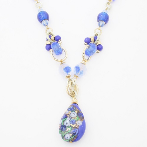 イタリア・水の都「ヴェネチア」からの贈り物 マエストロと呼ばれる熟練した職人たちがベネチアンガラスの伝統の技法を用い、一つ一つ丁寧に仕上げられた上品なアクセサリー。その美しい模様は、まるで芸術品とまで称されるほどです。可憐で大人っぽい色合いのネックレス。綺麗な海を連想させるそうな色合いは心を穏やかに落ち着かせてくれます純金箔をガラスの中に閉じ込めたその山吹色とブルードロップの色合いとのコントラストが美しいデザイン。大切な人への贈り物や、自分へのご褒美にも最適のアクセサリーです。