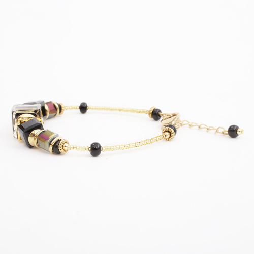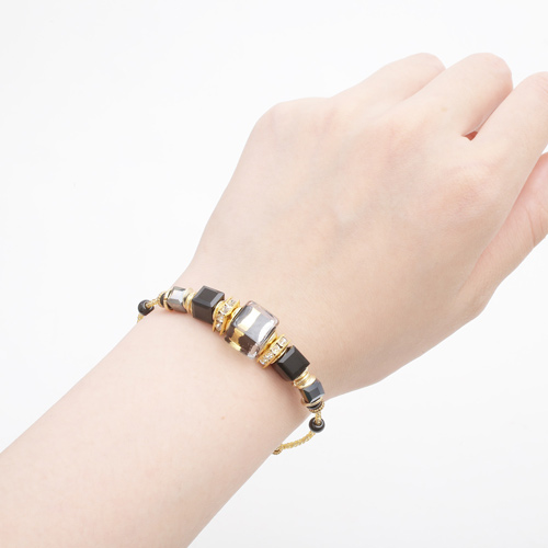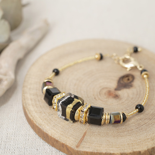ムラーノ島で作られたベネチアンガラスやビーズを使い、ベネチアよりほど近いメストレでジュエリーのデザインを手掛けるINESが当店の為に作った作品です。純金箔をガラスの中に封じ込めたその山吹色と漆黒の粗目仕上げとコントラストが美しい、とてもゴージャスなのにシーンを選ばず気軽に着けて頂けるビューティー・デザインのブレスレットです。決して自己主張はしていないのにこの圧倒的な存在感はイタリア人デザイナーならではです!長さは約16cm~20cmまでお好みの長さに調節できますのでウォッチとの重ね着けをされる場合には少しにできるうれしい仕様♪同デザインの色違いもございますので色違いで重ね着けも可愛くさらにオシャレ度がアップ!!自分へのご褒美や大切な人へのプレゼントにもおススメです。