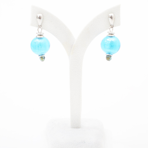 イタリア・水の都「ヴェネチア」からの贈り物マエストロと呼ばれる熟練した職人たちがベネチアンガラスの伝統の技法を用い、一つ一つ丁寧に仕上げられた上品なアクセサリー。その美しい模様は、まるで芸術品とまで称されるほどです。ハンドメイドガラスは、一つ一つ大きさや形、色合いが違い、ゆがんでいるように見えたり、欠けているように見えたり。これも手作りならではの良さで、世界に二つとないあなただけのピアスといえます☆丁度いいサイズ感で見た目から感じる重みは全くなく、軽い着け心地。純銀箔を綺麗なブルーガラスで包み込んだ鮮やか色合いが、幅広いファッションで大活躍のイタリアンピアス。大切な人への贈り物としても最適です。ハンドメイドだからこそのトレンドなデザインは周りと差が付くオシャレ上級者!シンプルなデザインに職人のこだわりを感じる逸品です☆
