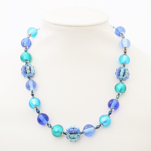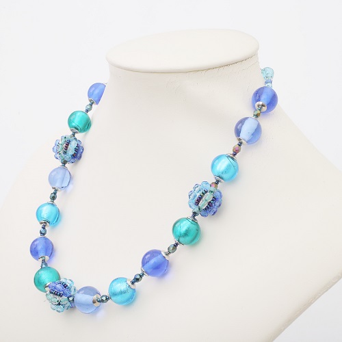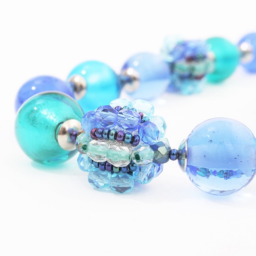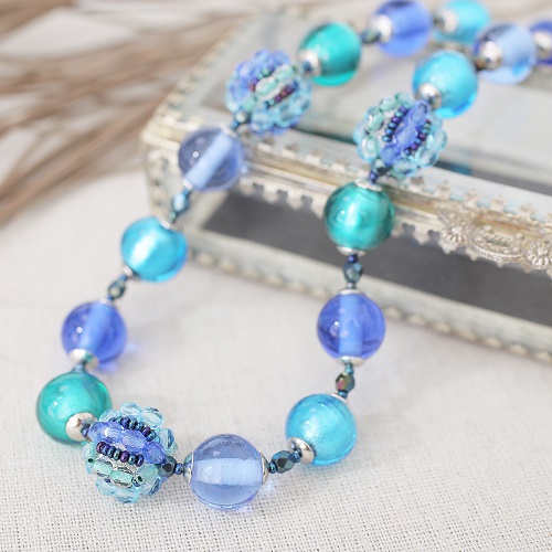 イタリアの最先端ファッションの都「ミラノ」。そこで活躍するジュエリーデザイナーのアヴェ・テッタマンティ。ベニスの熟練職人によるベネチアンガラスを使い、洗練されたデザインセンスとイタリア人ならではの色使いを持ち合わせ、イタリアはもちろん世界中の大人の女性たちを魅了しています。彼女の作品は決して派手すぎずそれでいて絶対的な存在感があり!重すぎず軽すぎない程よい重量感が魅力的♪純金箔を綺麗なブルーラスで包み込んだ優しい色合い。幅広いファッションで大活躍のイタリアンネックレス。