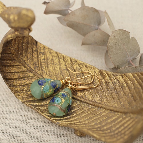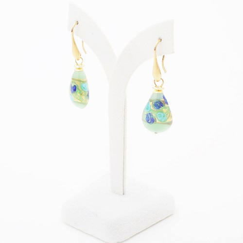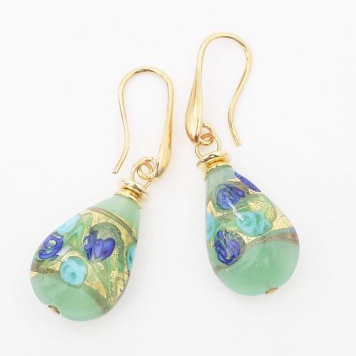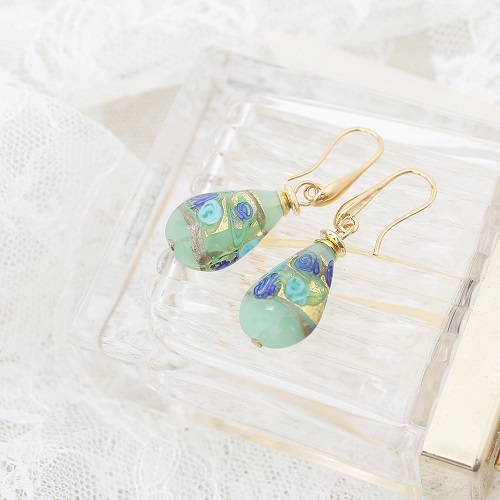 イタリア製<INES design>ゴルチェ・ブルー・ピアス。ヴェネチアンガラスで有名なイタリア・ムラーノ島、マエストロと呼ばれる熟練した職人たちが、伝統技法を用い一つ一つ丁寧に手作りしています。女性らしい大人っぽさを引き出すグリーンカラー。着けてみるとその色合いから感じる派手さは少なく、上品に自己主張をする大人のジュエリー。ベネチアンガラスの中に純金箔を閉じ込めた上品な色合いのグリーンドロップデザインは、イタリア人ならではの独特な美しさを放ち、毎日のお洒落に欠かせないアイテムに♪幅広いコーディネートでお使い頂ける女性らしいデザインのベネチアンピアスは、大切な人へのプレゼントや、毎日の自分へのご褒美にも大変おススメの大人ジュエリーです☆