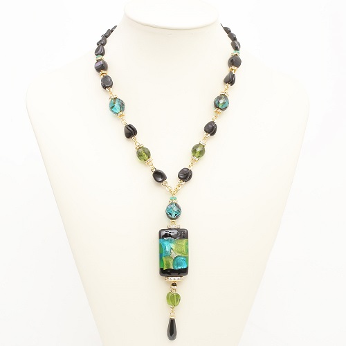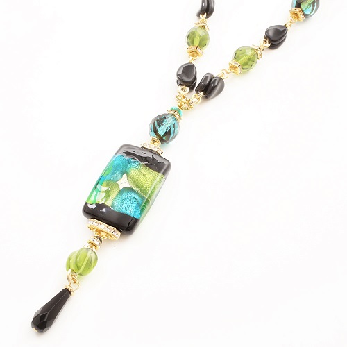 イタリア・水の都「ヴェネチア」からの贈り物 マエストロと呼ばれる熟練した職人たちがベネチアンガラスの伝統の技法を用い、一つ一つ丁寧に仕上げられた上品なアクセサリー。その美しい模様は、まるで芸術品とまで称されるほどです。可憐で大人っぽい色合いのネックレス。 綺麗な海を連想させるそうな色合いは心を穏やかに落ち着かせてくれます純金箔をガラスの中に閉じ込めたその山吹色とグリーンドロップの色合いとのコントラストが美しいデザイン大切な人への贈り物や、自分へのご褒美にも最適のアクセサリーです。