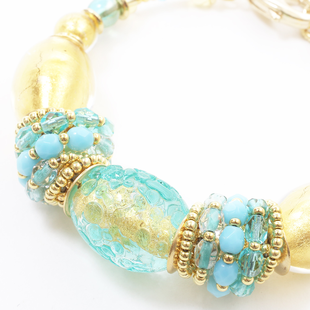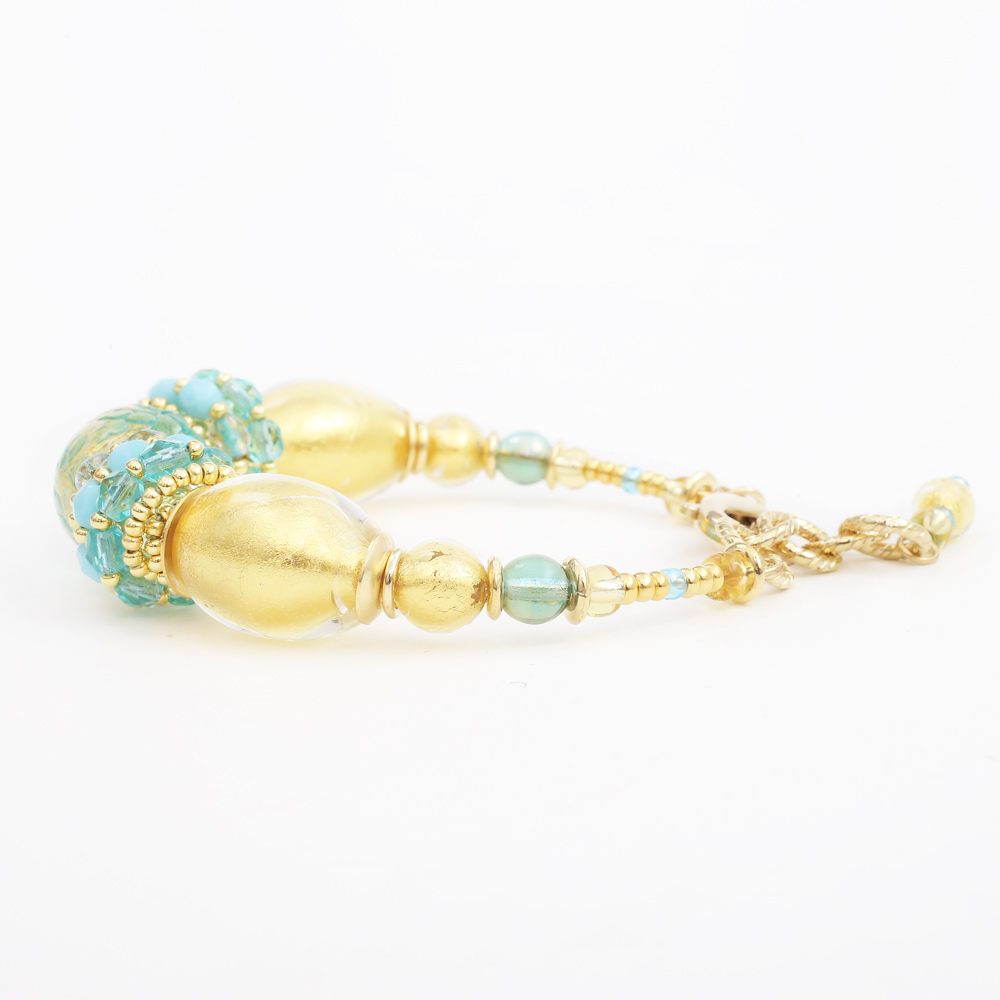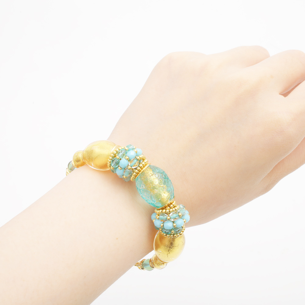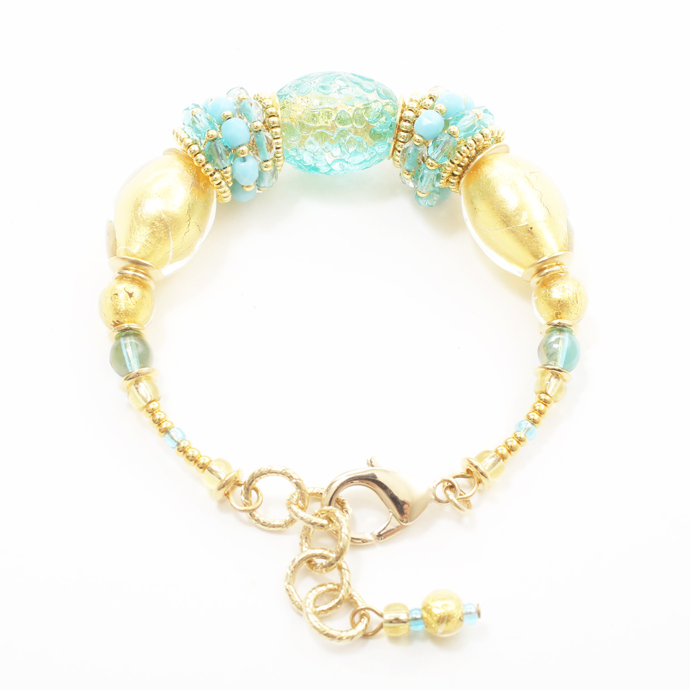 イタリア製 ベネチアンガラス ブレスレット 山吹色 ブルーグリーン アンティコ・ロザ 純金箔入り 7981-IN19