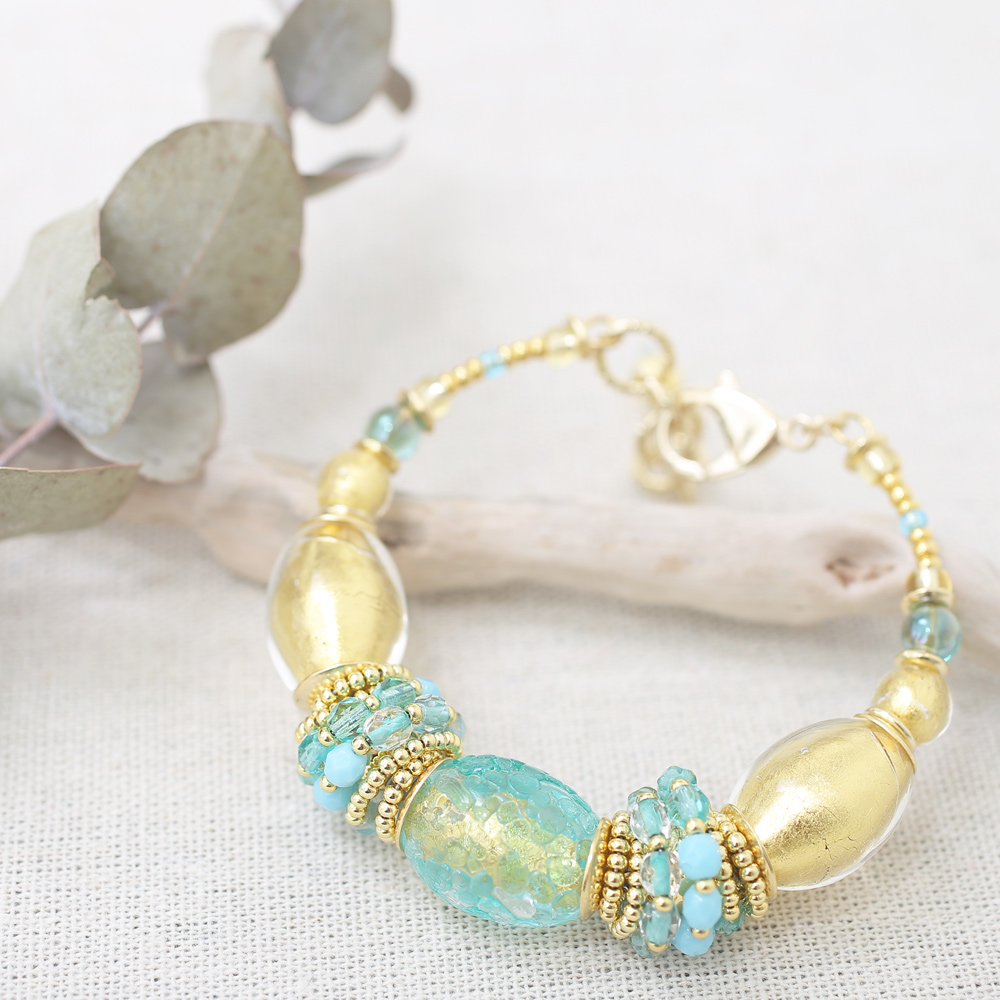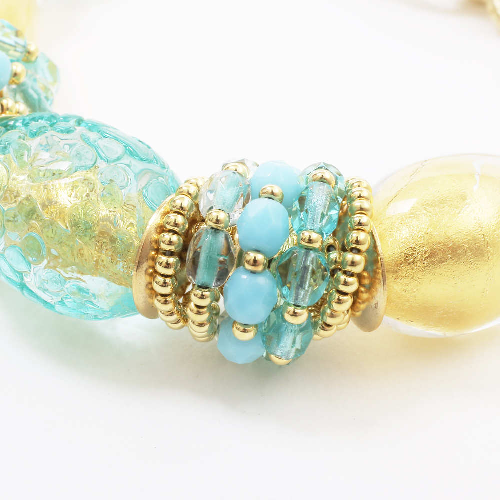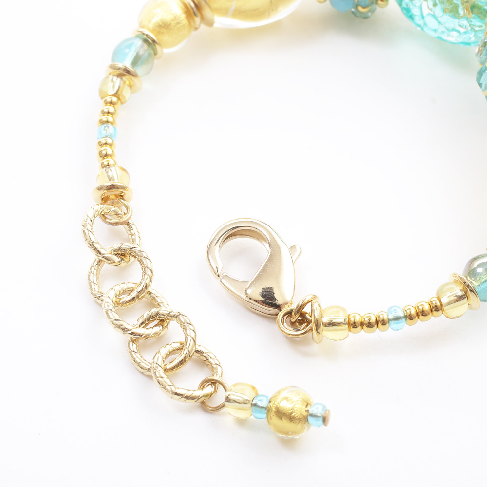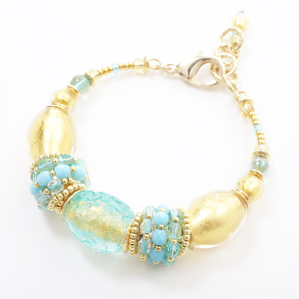 イタリア製 ベネチアンガラス ブレスレット 山吹色 ブルーグリーン アンティコ・ロザ 純金箔入り 7981-IN19