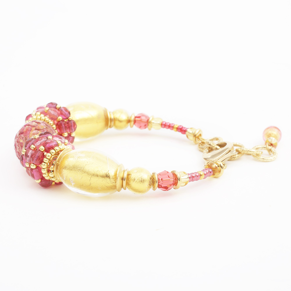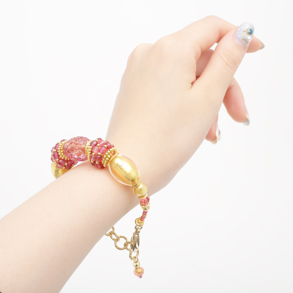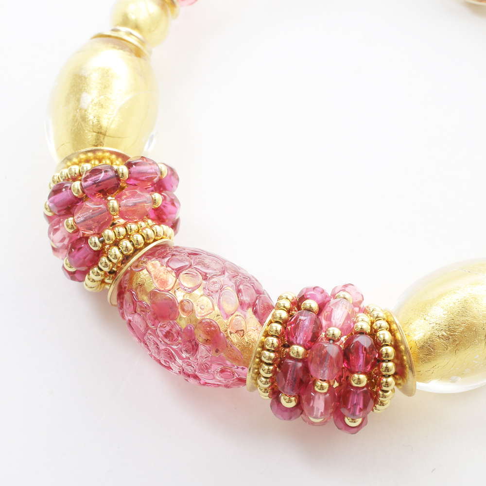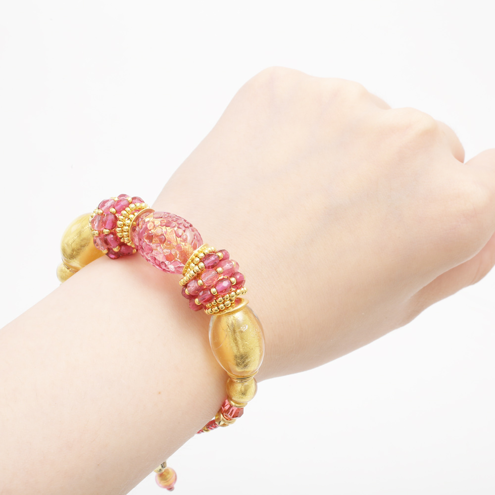 ムラーノ島で作られたベネチアンガラスやビーズを使い、ベネチアよりほど近いメストレでジュエリーのデザインを手掛けるINESが当店の為に作った作品です。純金箔をガラスの中に封じ込めたその山吹色とピンクの粗目仕上げとコントラストが美しい、とてもゴージャスで特別な日に大活躍するバングルタイプのデザインブレスレットです。着けてみると色合いから感じる派手さは少なく、むしろ上品に自己主張をする大人のジュエリーと言えます。別売りでネックレスとピアスをご用意しておりますので、トータルコーディネートで大人可愛い印象に♪自分へのご褒美やプレゼントにもおススメです!!